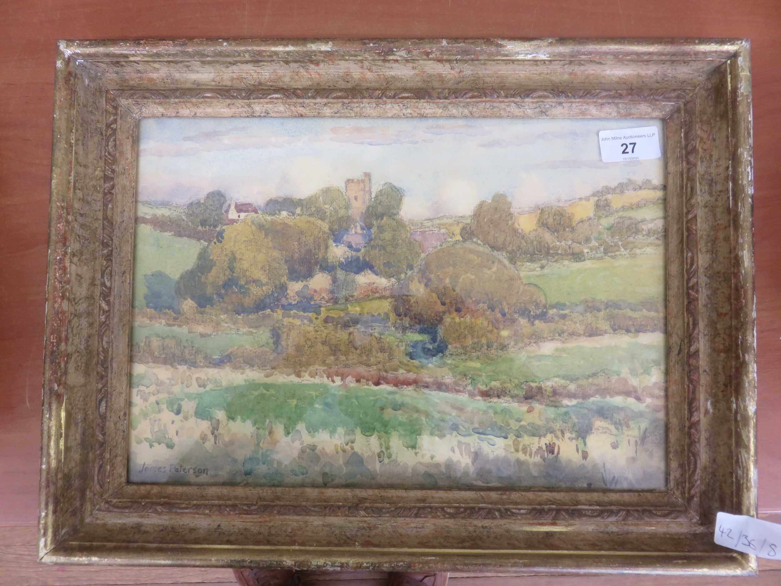 Gilt Framed Watercolour, Village and Landscape, James Paterson, 24x34cm